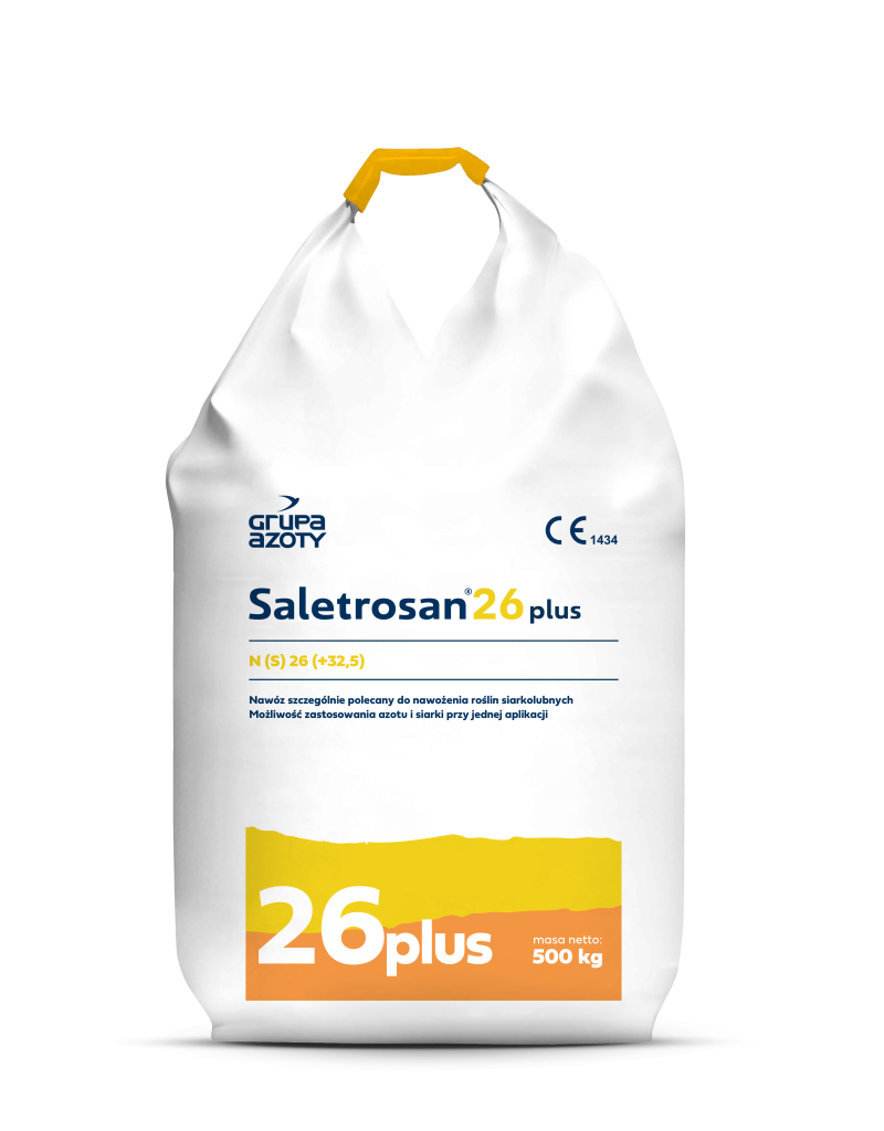 Najważniejszą zaletą tego nawozu jest możliwość zastosowania wiosną azotu i siarki. Azot w formie amonowej nie ulega wymywaniu z gleby, jest wolno pobierany przez rośliny, wpływa na dobre ukorzenienie roślin, wspomaga pobieranie fosforu i ogranicza nadmierne pobieranie potasu. Zawartość szybko działającej, saletrzanej formy azotu przyspiesza wegetację roślin krótko po zastosowaniu nawozu, czyli wiosną przyspiesza regenerację roślin po zimowym osłabieniu. Duża zawartość siarki siarczanowej, doskonale rozpuszczalnej w wodzie, uodparnia rośliny i zabezpiecza je w siarkę już od początku wiosennej wegetacji. Pamiętajmy, że największe niedobory siarki w glebie występują zawsze wczesną wiosną, po zimowym wymyciu z gleby. Stosowanie Saletrosanu® 26 plus powoduje dobre ukorzenienie roślin, zwiększa dynamikę ich wzrostu już we wczesnych fazach rozwojowych oraz poprawia ich odporność, decyduje więc o wzroście plonu i poprawie jego jakości.